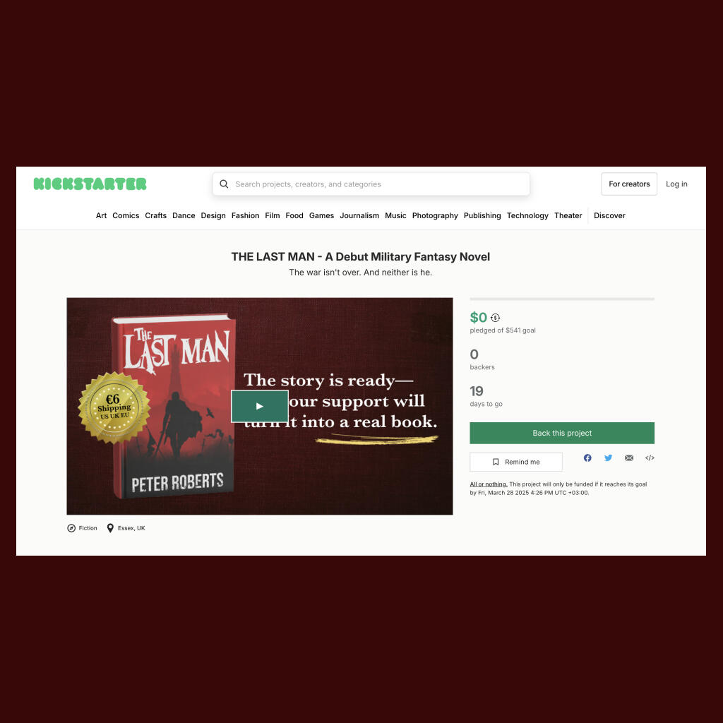 After years of dreaming, writing, and refining, my debut grimdark fantasy novel, The Last Man, is finally live on Kickstarter. It’s surreal to say that out loud—this story has lived in my head for so long, and now it’s out in the world, ready for readers who love gritty, progression-based fantasy as much as I do.If you’re into relentless protagonists who claw their way forward through sheer willpower, a magic system built on training and discovery, and a world where political and cultural tensions shape every battle, then The Last Man is for you. This book is my attempt to capture everything I love about the genre—the struggle, the depth, the slow, earned climb toward power.Kickstarter felt like the right way to launch it. This isn’t just about publishing a book; it’s about building something bigger. Through the campaign, I can offer backers special edition hardcovers, stunning artwork, and exclusive behind-the-scenes content—things that wouldn’t be possible through traditional publishing. It’s also a way to connect directly with readers who want to be part of the journey from the very beginning.If you want to help bring The Last Man to life, check out the campaign, grab a copy, and share it with anyone who might be interested. Every bit of support makes a difference, and I’m beyond grateful to everyone who’s been part of this so far.The story is already written, and your support can help turn it into a real book. Support the journey by visiting the Kickstarter campaign here